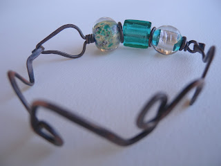 Hand-forged copper wire, textured and patinated, glass bead from lampwork artist Marjorie Lambert, silver copper glass beads.